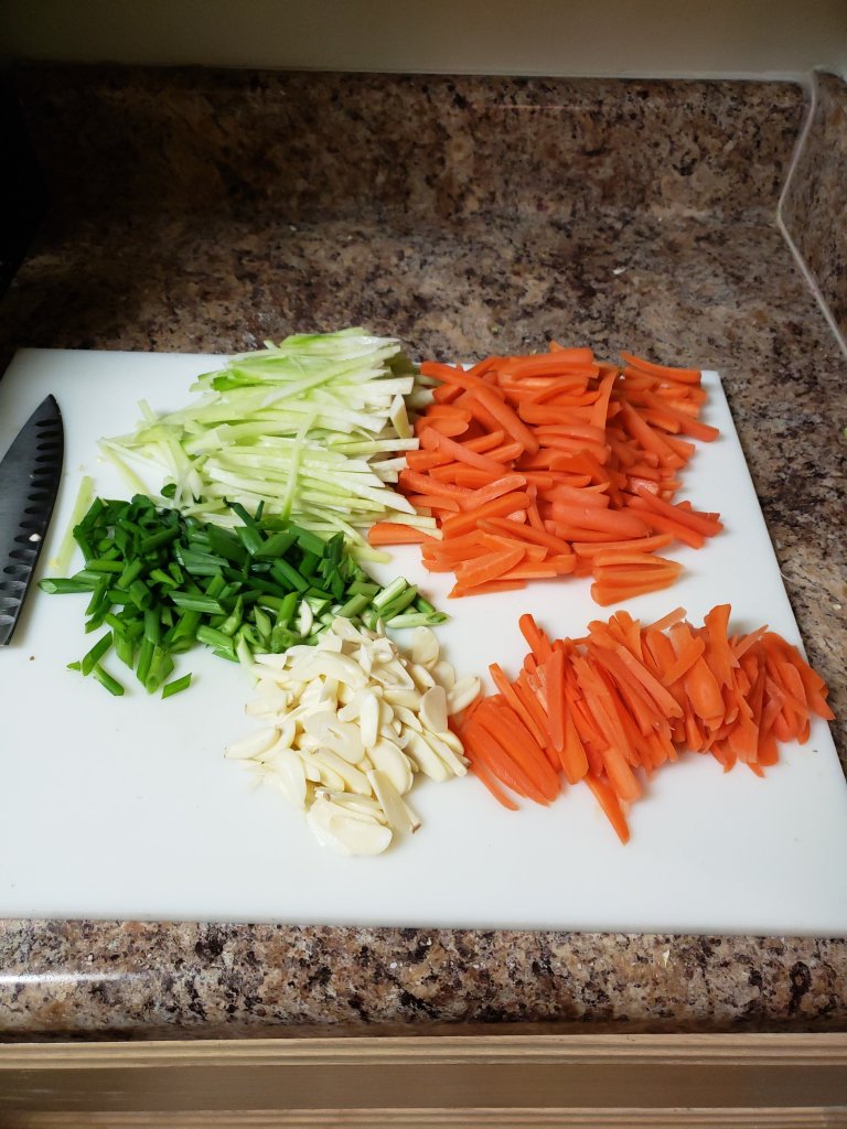 While your Cabbage is resting start thinly slicing your garlic, green onion, carrots, and korean radish. You can cut your vegetables by hand or on a mandoline. You can cut your vegetables thicker than I did if you want to, they will just take longer to soak up the kimchi paste. The great thing about making kimchi is that you can put any vegetable you want in there, for me I love green onion and bean sprouts so I always add a lot of both. Kimchi is so versatile, so take out or add whatever vegetables you like.