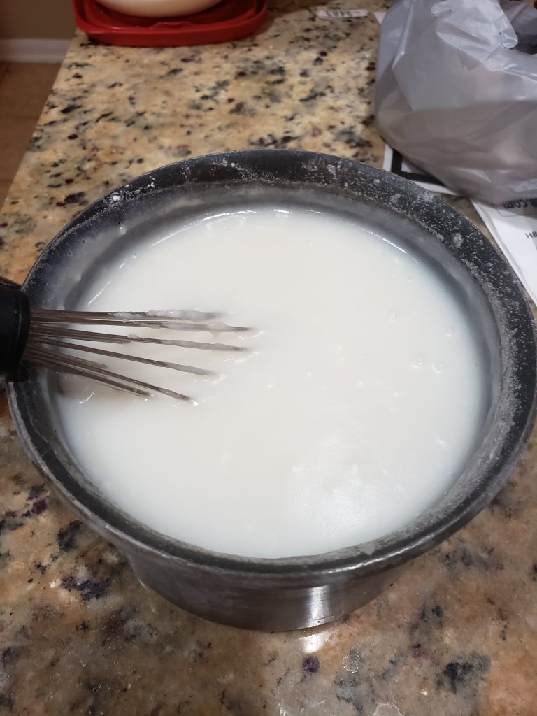 During the salting process you can start your rice porridge. Add your rice flour and water into a pot stirring it until all the lumps are gone. Set your burner to medium heat and stir occasionally for about 8 minutes or until you see bubbles forming. After this you can add your sugar and cook for an additional 2 minutes. Lastly remove from heat and cool down the rice porridge to room temperature.