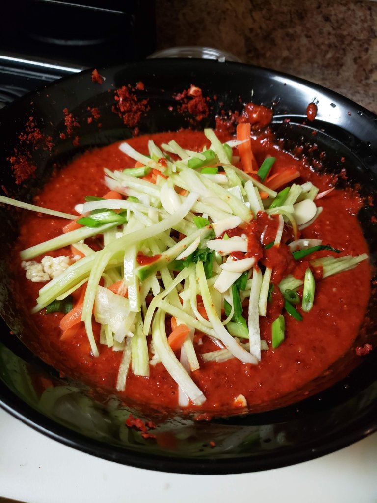 Take your ginger (fresh or paste), chopped white onion,chopped garlic, and fish sauce then put them in a food processor or blender and blend until it becomes a paste. If you dont have a food processor or blender then you can just chop your vegetables into a small dice and it will work the same as the paste. After making your paste in a mixing bowl add your onion paste, red pepper flakes, and your cooled rice porridge and mix until homogeneous. This red pepper paste is on the spicy side, so if you aren’t a fan of spicy food, then you can reduce the amount of red pepper flakes. Lastly, you will add all your sliced vegetables to the Red pepper paste and mix until it is incorporated.