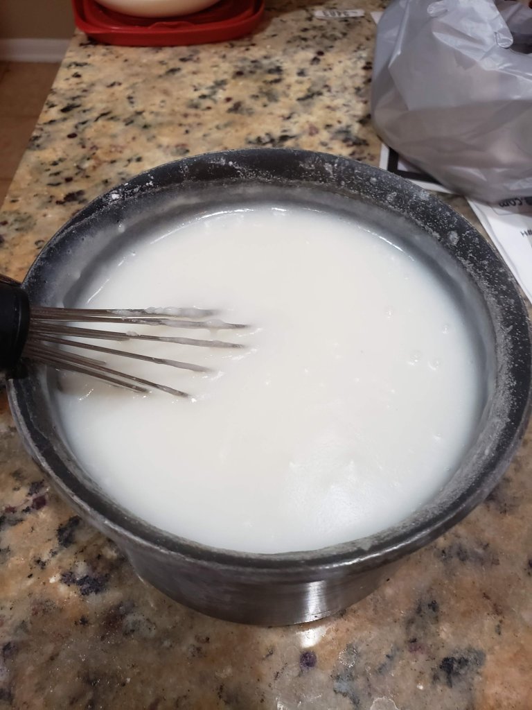 During the salting process you can start your rice porridge. Add your rice flour and water into a pot stirring it until all the lumps are gone. Set your burner to medium heat and stir occasionally for about 6 minutes or until you see bubbles forming. After this you can add your sugar and cook for an additional 2 minutes. Lastly remove from heat and cool down the rice porridge to room temperature.